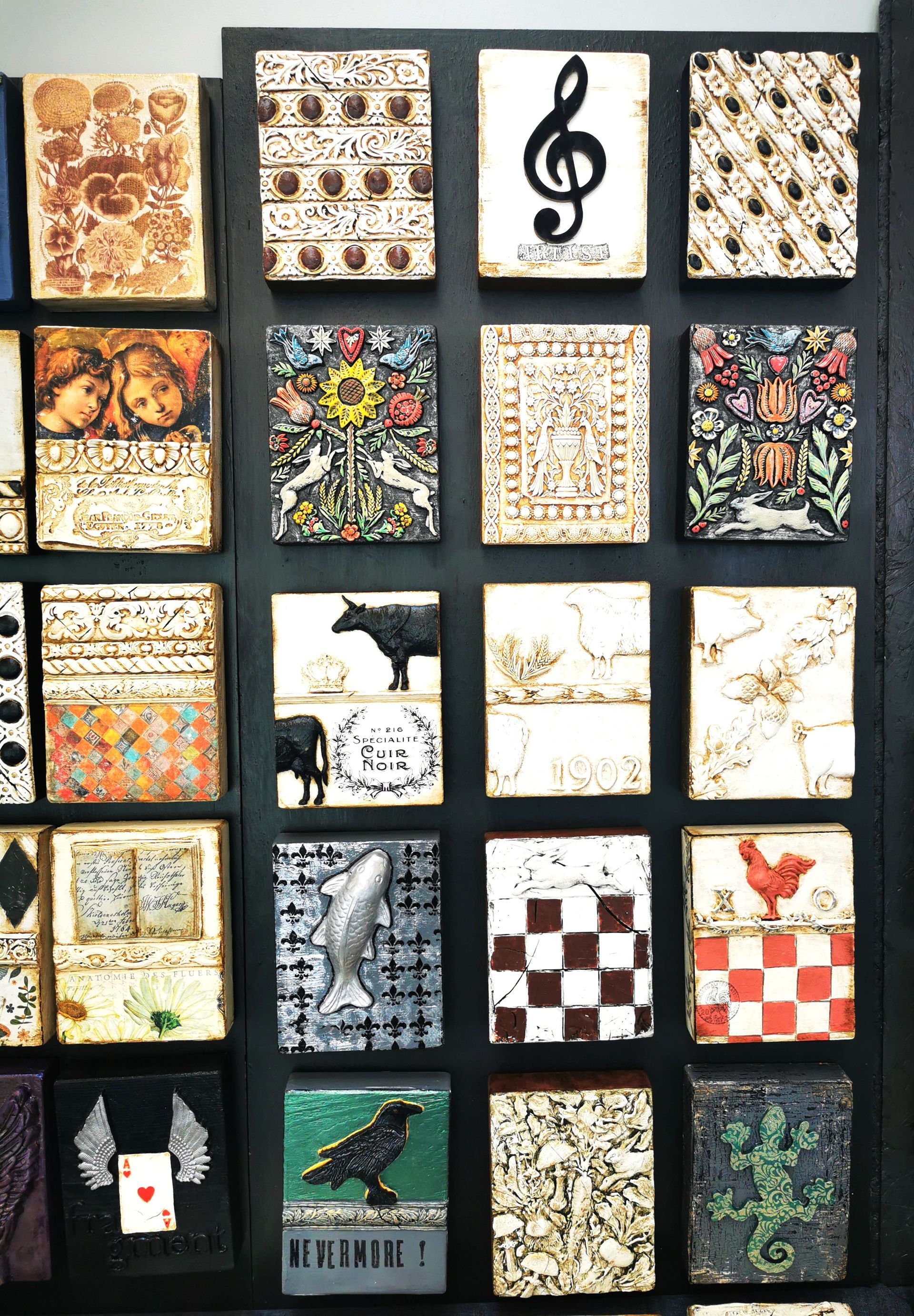 Die Fragmente Blocks sind aus massiven Holzblöcken (20 x 15 x 4 cm). Diese werden von mir unter anderem mit Gips und Modelliermasse bearbeitet, aufwändig patiniert und anschließend mit Antikwachs versiegelt. Hierbei spielt insbesondere die Optik von alten Fliesen, Ruinen, Palästen und alten Gemälden die Hauptrolle in der Umsetzung. Mein Ziel ist es, die Fragmente 'perfekt unperfekt' zu vollenden.